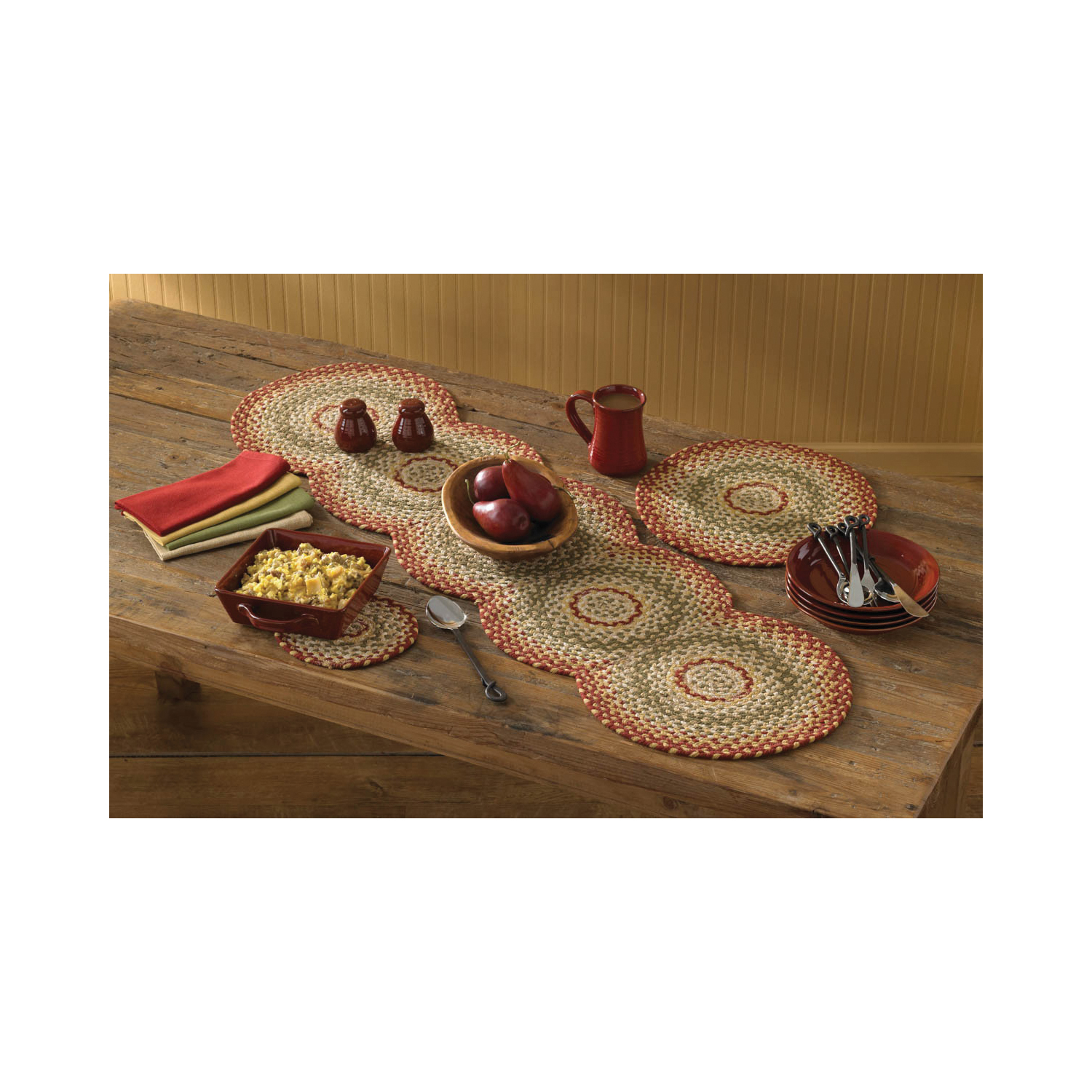 Mill Village features a spicy palette of gold, wine, green and cream. Mill Village works beautifully with our Casual Classics ceramics and textiles. Our new braided tabletop coordinates beautifully with our new floor coverings. Made of 100% cotton yarn, tumble dry low.