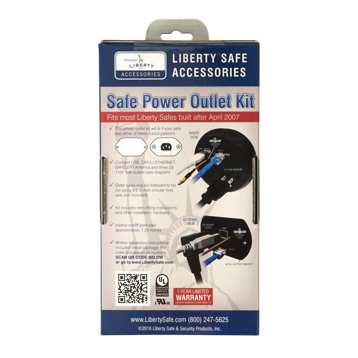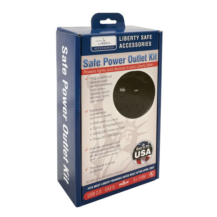 This new multi-functional outlet Kit allows you to plug in electrical devices such as dehumidifiers, hard-drives, laptops, watch winders, lights and more. The Liberty Safe outlet Kit includes a USB and CAT-5 Ethernet ports, along with three 110 V outlets. It includes a pass-through hole for Liberty's SAFELERT monitoring device's antenna. The gun safe electrical outlet Kit is easy to install and can be adjusted to the various thicknesses found in Liberty's fire safes. It includes 6 ft power cord with convenient 90 deg angles for easier wall plug-in and tight spaces.
