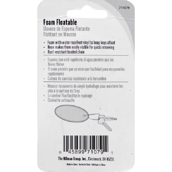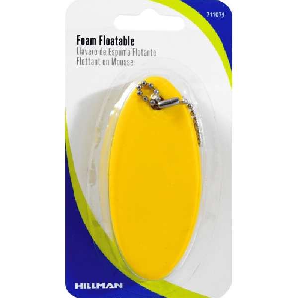 The Hillman foam base is designed to keep keys afloat when dropped in the water. Great for boating enthusiasts and others that work in/on the water. Features water repellent vinyl to keep up to five keys afloat. Bright yellow orange make it easy to locate. Rust-resistant beaded chain.