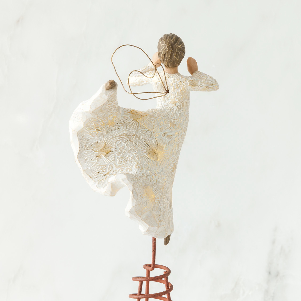 Sparkling with gold, song of joy tree topper provides an angel option with golden wings. The circular frame elevates the gesture and form of the angel above the tree. A gift of Willow Tree® communicates beyond words.