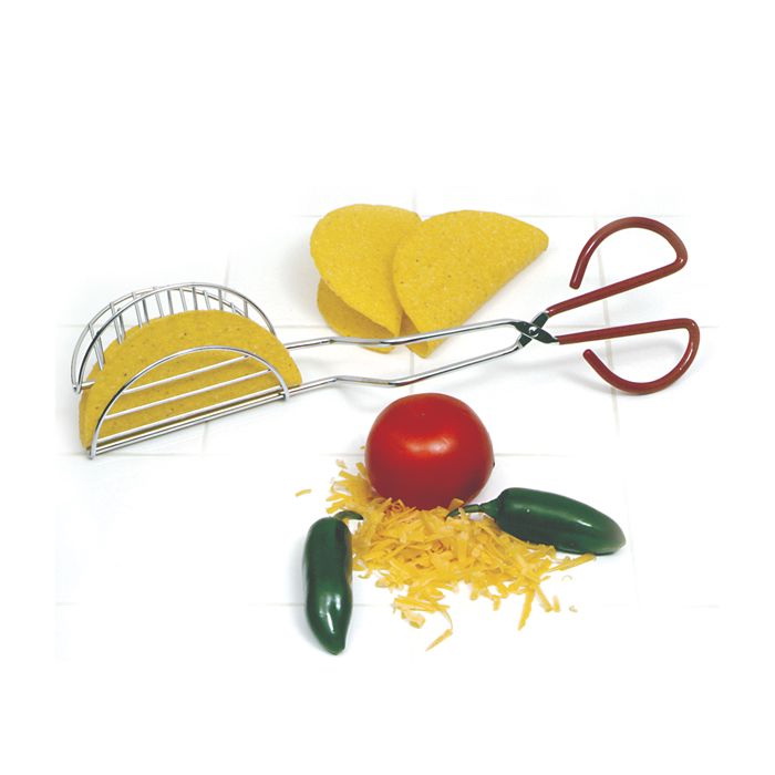 Fresh tacos shells are so much better tasting than store bought! The process of making tacos at home just got so much easier, with this uniquely designed taco press! Use to mold tortillas into fresh, crisp, fried taco shells! Faster, safer and easier than the old fork and tong method. Simple and easy to use! Perfect tacos every time. The L-shaped handle rests on the fryer rim to protect your hands from hot oil. Made of chromed steel, with stay-cool rubberized plastic handle grips. Great for use with corn or flour tortillas.
