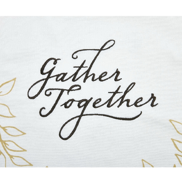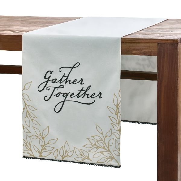 At 100% cotton this 16 in W by 72 in L table runner has an exquisite feeling and look of high caliber craftsmanship. This banner of love draped effortlessly over any table accent the home seamlessly to create a warm and homey, yet stylish theme, with a Gather Together Quote on each end.