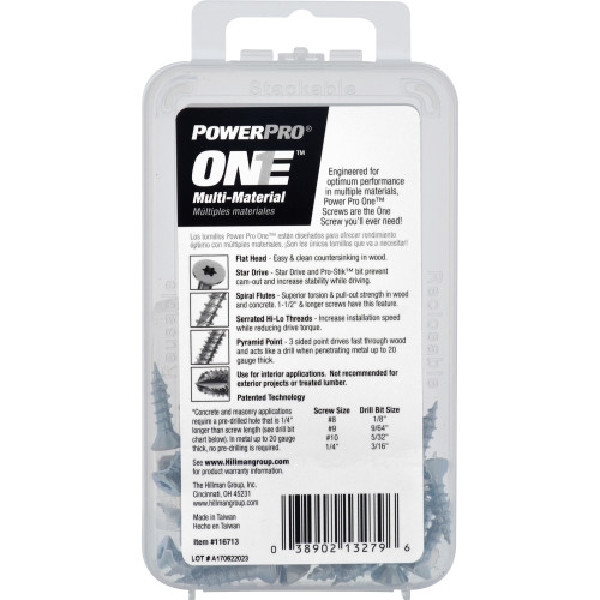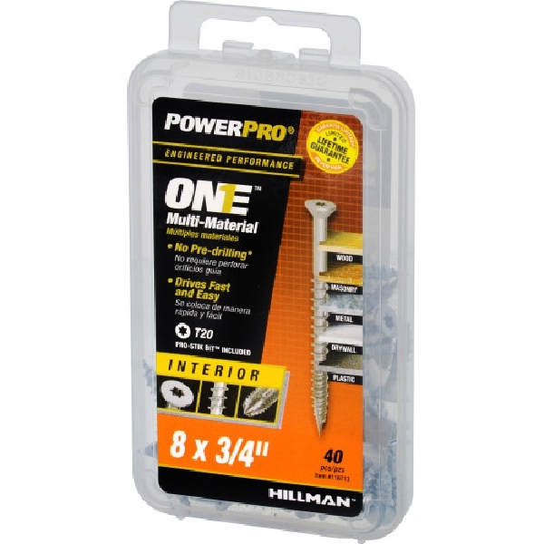 Engineered for optimum performance in multiple materials, Power Pro One screws are the One screw you'll ever need. Developed to outperform and replace standard wood, sheet metal and concrete/masonry screws, the One screw program simplifies your toolbox by using a single, innovative, engineered screw design to satisfy projects that fasten into wood, metal, concrete, drywall and plastic. This zinc-plated screw is ideal for interior applications. it is not recommended for exterior projects or treated lumber. Common applications include electrical, plumbing and metal projects. The pan head design and star drive provide an exposed finish look and strong draw down power. Manufactured with spiral flutes, serrated hi-lo threads and a three-sided pyramid point, no pre-drilling is required in wood, drywall, plastic or metal up to 20 ga thick. Concrete and masonry applications require a pre-drilled a hole. Each package includes a free durable Pro-Stik star driver bit.