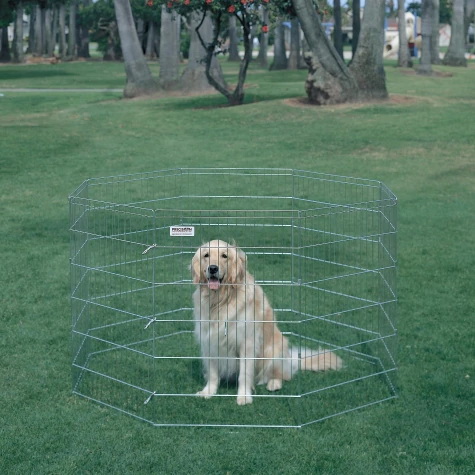 Keep your pet out of mischief with a Precision Pet® choice exercise pen. Exercise pens are also a good playground for pets indoors and outdoors. Available in a variety of sizes for dogs of all breeds, each Choice Pen comes with eight, 2 ft wide panels that can be set up as a 16 ft "fence" or exercise pen. Made of durable, solid steel construction with a long lasting silver zinc finish. The drop pin design makes certain that there are no exposed screws, wires or pins for added safety. A convenient, easily foldable design makes the choice pen perfect for camping, travel or storage and can even be attached to your wire crate to give your pet added play space. Recessed fasteners protect your floor's surface making it great for indoor use as well. Designed to be used with a variety of pets.