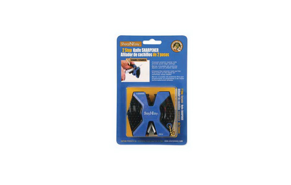 The SharpNEasy® two-step knife sharpener is an innovative tool that everyone can use. The ceramic rods, dark for coarse and white for fine, are exactly what you need to care for and maintain your blades. The two stages allow for the proper angle everytime by having two stationary ceramic rods molded into the base. The two-step sharpener also has over molded grips. The over molding process allows the user to have a comfortable and secure grip while sharpening. The unit has a lanyard hole which allows for easy attachment to cord or string.