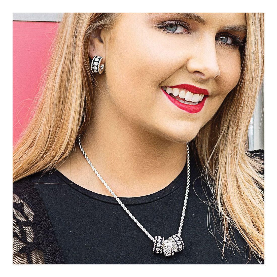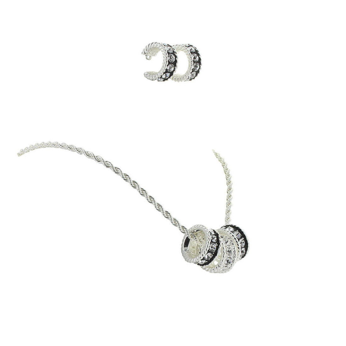 One of our most popular designs, Crystal Shine features a necklace of one silver ring flanked by two black ring bands of clear crystals and rhinestones hanging on a silver rope chain. Matching small hoop earrings feature clear crystals around black and silver bands. The silver rings and hoops are trimmed with twisted silver rope for that extra shine.