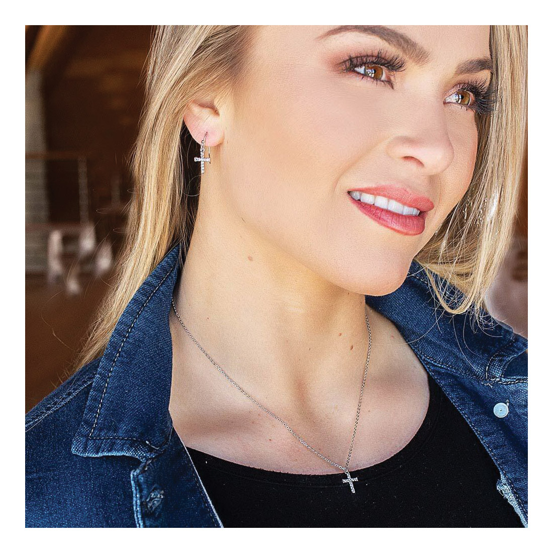 A great jewelry set for those that want their show of faith to shine brightly. This cross jewelry set has a simple true cross shape with the arms slightly shorter than the length of the vertical bar. A single row of bright clear stones line the vertical and horizontal bars of the cross, set in a simple bright silver-tone setting. The cross necklace pendant hangs on a princess length, 19 in chain. The matching earring pendants have a top loop connecting to hypoallergenic stainless steel French wires.